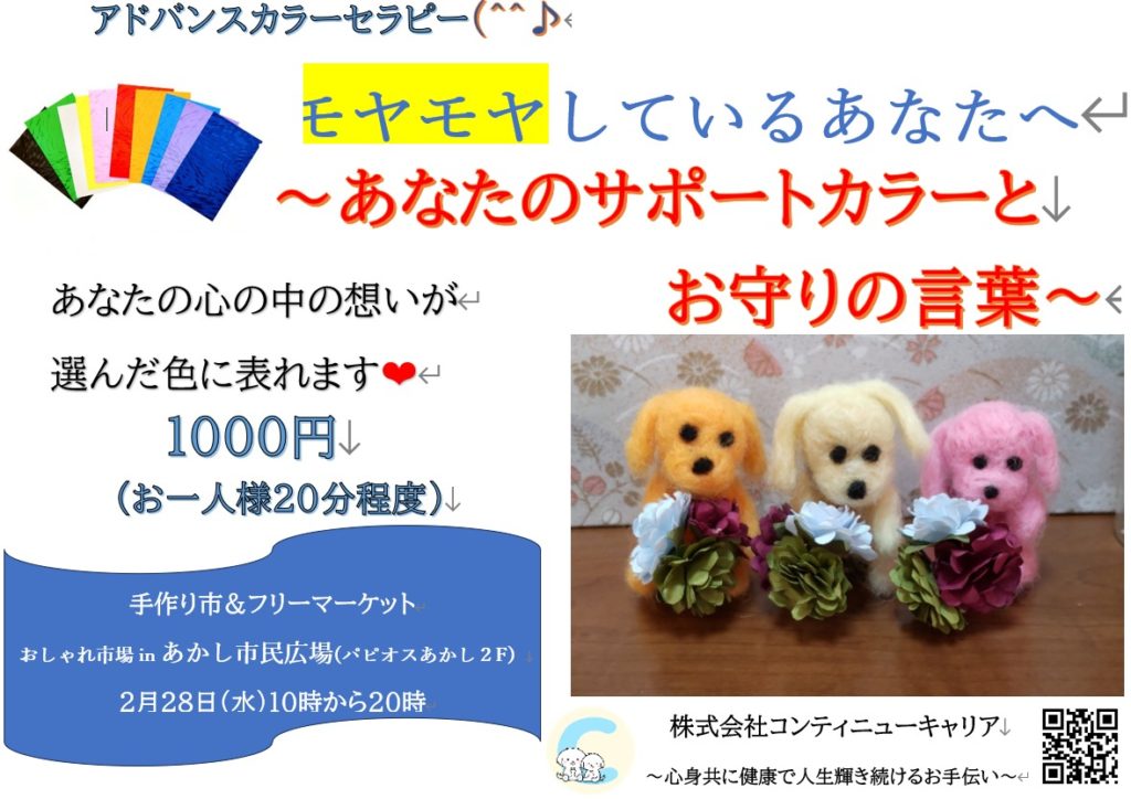 イベント出展のお知らせ❣ 2024年1月31日 最終更新日時 : 2024年3月12日 milkmama R6年2月28日水曜日手作り市&フリーマーケットおしゃれ市場inあかし市民広場(パピオスあかし2F)アドバンスカラーセラピー お一人様20分程度~ 1,000円 羊毛フェルトアート作品の販売 200円~ 最近何か「モヤモヤ」しているな~「イライラ」するのはなんでなのかな~自分は何がしたいのかな~もっと自分に自信をもちたいな~決断力が欲しいな~ 沢山のブースが出展します。お買い物ついでにお立ち寄りください。お待ちしています❣ \ 最新情報をチェック / FacebookXBlueskyHatenaCopy
